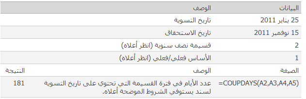 إذا لم تكن settlement أو maturity عبارة عن تاريخ صحيح، فإن COUPDAYS تُرجع قيمة الخطأ #VALUE!.