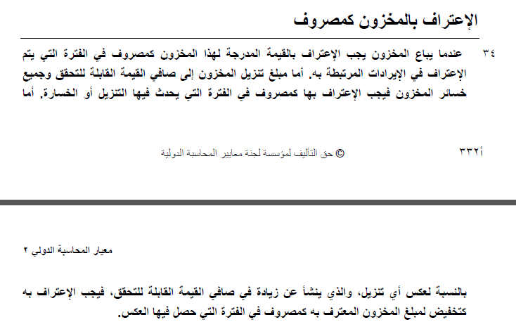 بشكل مبدئي المعالجة القياسية طبقاً للمعيار المحاسبي الدولي رقم 2 الخاص بالمخزون و التي تم ذكرها في الفقرة رقم 9 من نفس المعيار هي " يقيم المخزون بالتكلفة أو صافي القيمة القابلة للتحقق أيهما أقل "