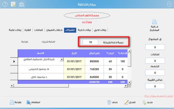 ملحوظة لتحديد نسبة الادارة للمشروع 10 % على سبيل المثال من بطاقة مركز التكلفة بيانات الشركاء حدد النسبة