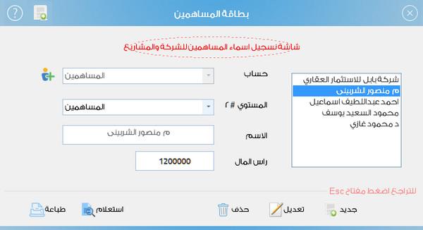 ال** خطوة الاولي** فتح حسابات فى الدليل المحاسبي باسماء المساهمين من قائمة بطاقات - بطاقة المساهمين كما موضح فى الشكل وسجل اسماء المساهمين وراس المال الموضح هو اجمالى راس المال فى الشركة ككل ويتم تخصيص حصة لكل مشروع سوف يدخل فيه المساهم